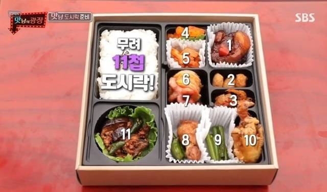 백종원이 어르신들을 위해 계획한 도시락은 정성을 가득 담은 무려 11첩 반상. 백종원은 “비엔나 소시지, 분홍 소시지, 닭봉 조림, 돼지고기 장조림, 어묵조림, 느타리버섯 튀김, 가지볶음, 마늘쫑 볶음, 새우볶음, 단무지 무침, 김치볶음, 11개 반찬을 해야 한다. 50개 필요하다. 12시까지 해야 한다”고 말했다.
