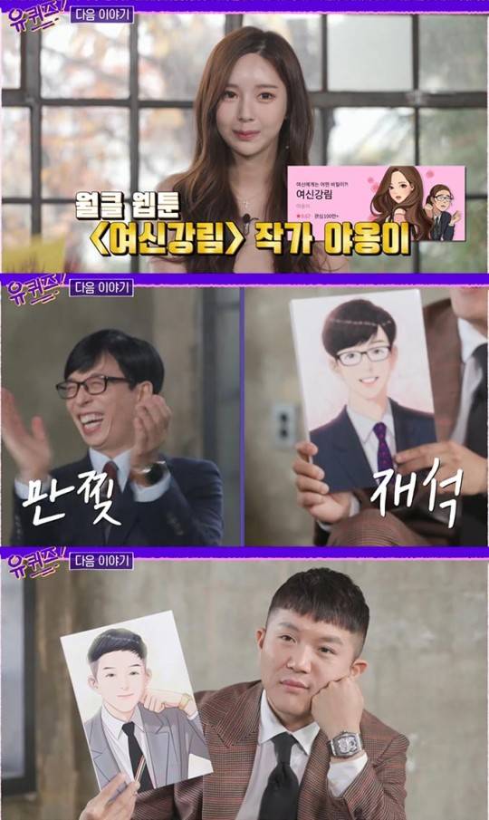 야옹이 작가는 누적 조회수 40억 뷰의 월드클래스 웹툰 작가로 소개돼 두 MC의 탄성을 자아냈다. 이어 야옹이 작가는 유재석, 조세호에게 직접 그린 ‘여신강림 버전 초상화’를 선물하기도 했다. 조세호는 실물과 사뭇 다른 그림 속 자신의 모습을 보고 웃음을 터뜨렸고, 유재석은 ‘만찢재석’ 비주얼에 만족한 듯 손뼉을 쳤다.