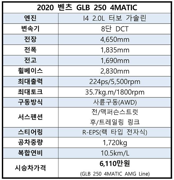 시승차는 2.0L 가솔린 터보엔진과 8단 DCT, 사륜구동 4MATIC이 맞물린 GLB 250 4MATIC 모델이다. 하위 트림인 GLB 220와 같은 파워트레인을 사용하지만 더 여유로운 힘을 제공한다.