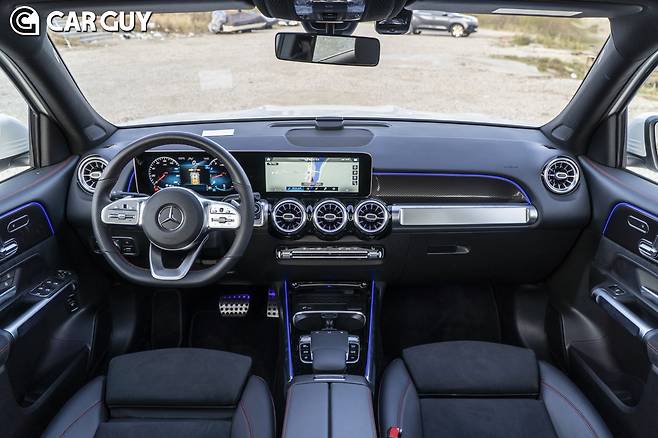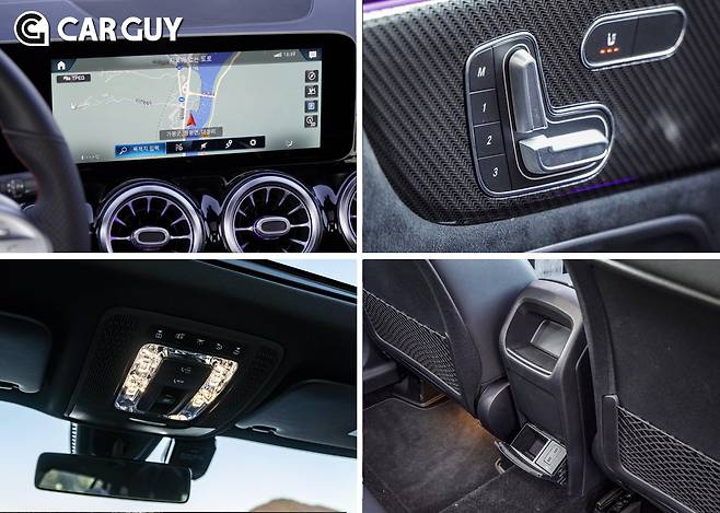 최신 벤츠의 상징인 나란히 배치된 두개의 10.25인치 모니터와 동그란 송풍구가 시선을 사로잡는다. 앞서 출시된 A클래스, CLA와 동일한 구성이다. 첨단 감각과 고급감이 동시에 느껴진다. 곳곳에 두꺼운 알루미늄 장식을 사용해 견고한 이미지를 더한 것도 특징이다. 밤에는 화려한 엠비언트 라이트가 더해져 시각적인 즐거움을 더한다. 시승차는 레드포인트 스티치와 D컷 스티어링 휠, 리얼 카본 장식을 추가해 스포티한 분위기를 냈다.