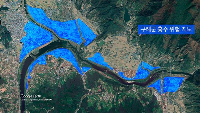 아래 사진은 올해 8월 섬진강 범람으로 혹독한 수해를 입은 전남 구례군의 홍수위험지도를 실제 침수 피해 신고 장소와 겹쳐본 것입니다. 보다시피 상당 부분 일치합니다.