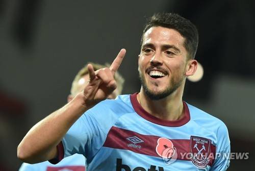 epa08789387 West Ham?s Pablo Fornals celebrates after scoring the 0-1 goal during the English Premier League soccer match between Liverpool FC and West Ham United in Liverpool, Britain, 31 October 2020. EPA/Peter Powell / POOL EDITORIAL USE ONLY. No use with unauthorized audio, video, data, fixture lists, club/league logos or 'live' services. Online in-match use limited to 120 images, no video emulation. No use in betting, games or single club/league/player publications.