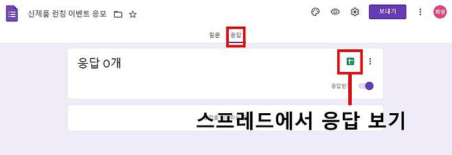 설문 결과는 스프레드시트에서 확인한다. 설문 답변을 확인하기 위해 '응답'을 누른다. 응답 오른쪽에 나타난 숫자는 응답자 수다. '응답'을 누른다. 응답 갯수와 응답에 대한 요약을 확인할 수 있다. 요약 내용은 질문 유형에 따라 결과를 그래프 형태로 보여주기도 한다.