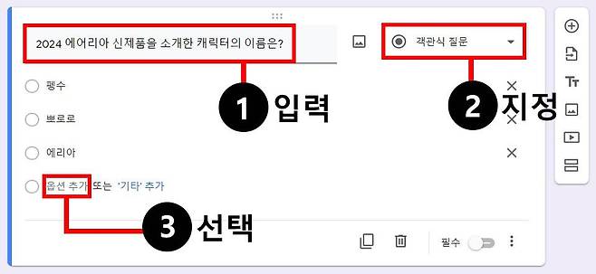 '제목없는 질문'을 눌러 질문을 입력한다. 질문 유형은 오른쪽 목록에서 '객관식 질문'으로 지정한다. 객관식은 답변을 하나만 선택할 수 있다. '옵션 1'을 선택하면 보기를 입력할 수 있다. 추가로 보기를 입력하려면 '옵션 추가'를 선택하고 입력한다. 예시에서는 답변을 포함해 총 4개 보기를 입력했다.