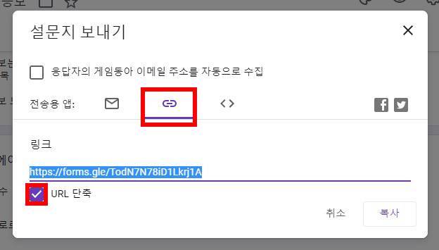웹사이트나 블로그, SNS 등에 구글 설문지를 공유할 경우가 있다. 이럴 때는 링크와 태그를 이용해 설문지를 공유한다. '설문지 보내기 대화상자'에 있는 전송용 앱 항목에서 '링크' 버튼을 선택한다. 링크 주소가 아래에 나타난다. 'ctrl+c'를 눌러 복사하거나, 오른쪽 아래에 '복사' 버튼을 눌러 복사한다. 링크가 길다고 생각한다면, 왼쪽 아래 'url 단축' 체크박스를 선택한다. 그 다음, 원하는 곳에 링크를 붙여넣어 전송한다.
