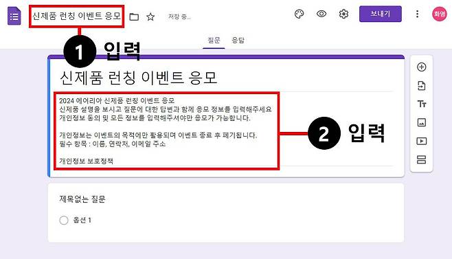 구글 설문지에 접속하고 '새 양식 시작하기'에서 '내용 없음'을 선택해 새로운 설문지를 만든다. 왼쪽 위에 설문지 이름으로 저장할 이름을 입력한다. 그 다음, 설문지 목적을 설명하는 데 필요한 내용을 입력한다.