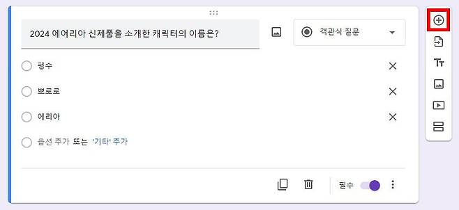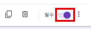 설문을 답변하는 사람이 필수로 설문에 답하게 만드려면, 오른쪽 아래 '필수'에 있는 '토글 스위치'를 선택해 질문을 완성한다.