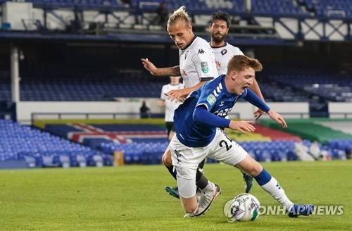 epa08674430 Anthony Gordon (front) of Everton in action against Oscar Threlkeld of Salford during the English Carabao Cup second round match between Everton and Salford City in Liverpool, Britain, 16 September 2020. EPA/Jon Super / POOL EDITORIAL USE ONLY. No use with unauthorized audio, video, data, fixture lists, club/league logos or 'live' services. Online in-match use limited to 120 images, no video emulation. No use in betting, games or single club/league/player publications.