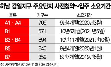 11일 업계에 따르면 2010년 11월 당시 사전청약을 받았던 경기도 하남 감일지구 보금자리주택 7개 단지 3173가구 중 아직 3개 단지는 입주를 하지 못한 것으로 확인됐다. B1·B3·B4블록이 대상 단지로, 당시 사전청약을 통해 받은 입주예약 물량은 1465가구다.