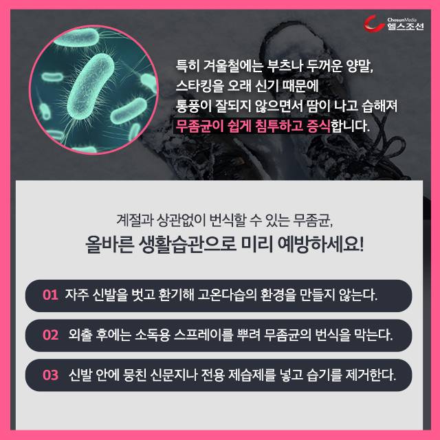 ① 자주 신발을 벗고 환기해 고온다습의 환경을 만들지 않는다.