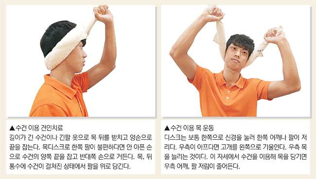 병원에는 견인 치료기나 물리치료사가 목을 당겨주는 견인치료를 합니다. 집에서도 혼자 할 수 있는 셀프 견인법을 배워봅시다. 긴 수건이나 긴팔 옷을 이용해 집에서도 견인치료를 혼자서 할 수 있습니다. 긴 수건이나 긴팔 옷을 이용하면 팔을 뻗어서 힘을 쓰기가 쉽죠. 앉거나 서서 견인을 합니다. 침대나 소파 끝에 누워서 견인해도 됩니다. 머리 위치를 침대 끝이나 조금 밖에 둬 목 근육이 잘 이완되게끔 합니다.