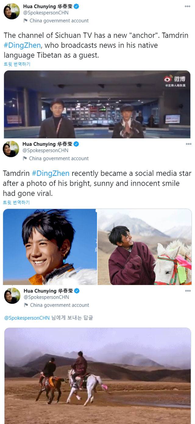 화춘잉 외교부 대변인은 아예 트위터에 딩전 관련 트윗을 3개나 올리며 그를 해외 네티즌들에게 소개하기도 했습니다.