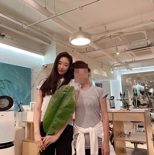 사진 속 김사랑은 커다란 잎을 들고 에코 필라테스 강사와 함께 다정히 머리를 맞댄 채 카메라를 향해 빙긋 미소 짓고 있다.