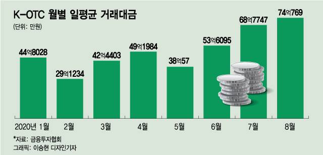 금융투자협회에 따르면 지난달 K-OTC 일평균 거래대금은 74억769만원을 기록, 전년 동기(28억5964만원) 대비 160% 가까이 늘었다. K-OTC는 금융투자협회가 운영하는 장외주식시장이다. 이는 올해 들어 월간 기준 최대치다. 역대로 봐도 지난해 11월(113억6000만원), 12월(74억3700만원)에 이어 세 번째다.