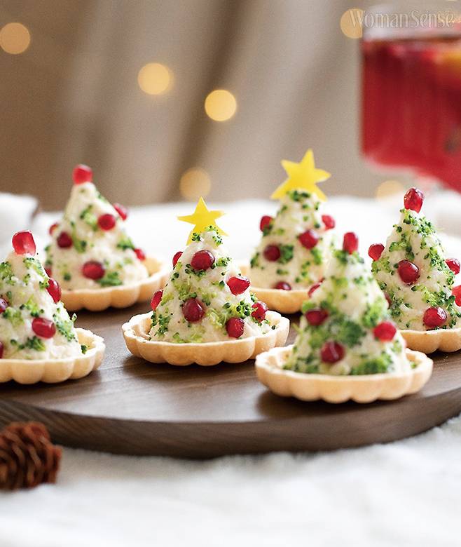 4 으깬 브로콜리와 석류알을 얹고 별 모양으로 자른 파프리카 조각을 맨 위에 올린다.