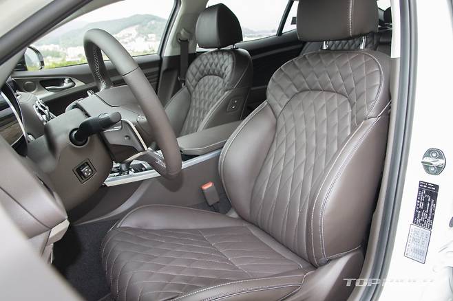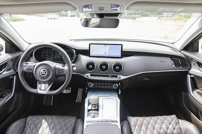 10.25인치 센터페시아 디스플레이는 경계를 매끄럽게 처리한 심리스 디자인이다. 다이아몬드 퀼팅 나파 가죽시트와 도어트림에 리얼 스티치가 추가됐다. 스티어링 휠에는 차로유지보조 버튼이 더해지며 버튼 배열이 변경됐다. 그외 레이아웃은 기존 스팅어와 같다.