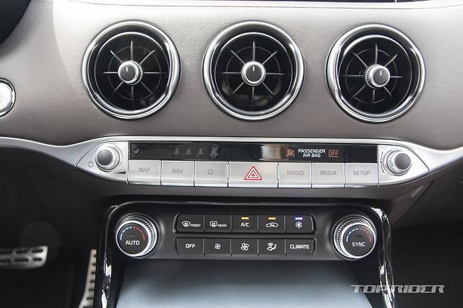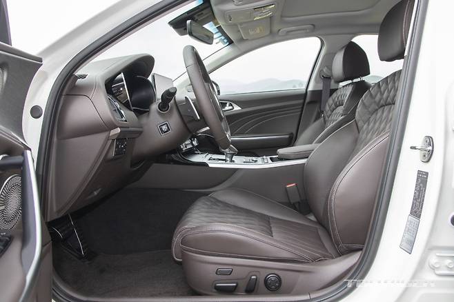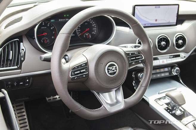 실내는 기존 스팅어 대비 고급감이 높아졌다. 10.25인치 센터페시아 디스플레이가 새롭게 적용됐다. 계기판은 후측방 모니터를 지원하는 7인치 컬러 TFT LCD 모니터가 추가됐다. 최근 현대차 준중형 세단에도 선택할 수 있는 디지털 계기판이 빠진 것은 의아하다.
