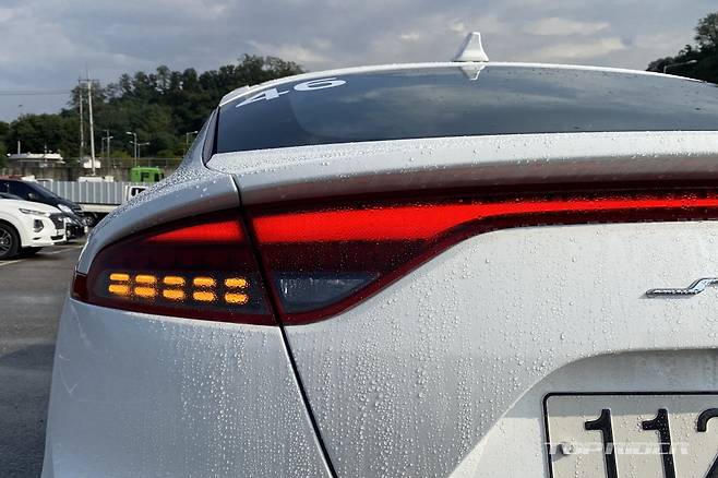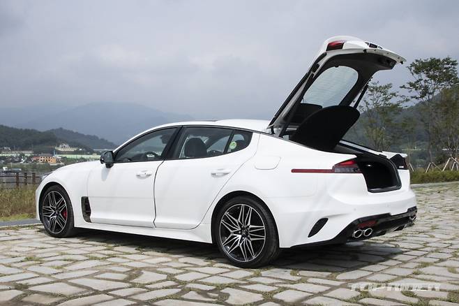후면부 테일램프는 좌우가 연결된 가로바도 점등된다. 수평적으로 길게 뻗어 와이드함을 부각한다. 특히 모터스포츠 체커 플래그 문양을 입체적으로 형상화한 LED 방향지시등은 순차적으로 점등된다. 스팅어의 트렁크 용량은 406ℓ며 2열 폴딩시 최대 1114ℓ까지 확대된다.