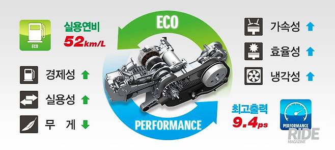 이외에도 넓은 발판 공간을 확보하여 주행 시 쾌적한 라이딩 포지션을 제공하며 큰 짐을 적재하여 운반하는 목적으로 리어 캐리어를 기본 채용해 짐 적재를 위한 탑 케이스나 업종별 비즈니스 용도에 맞는 수납함을 간편히 설치할 수 있어 실용적이며 편리하다.
