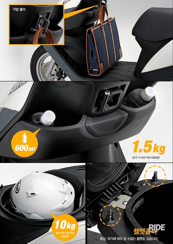 수납공간은 헬멧 등 수납에 용이한 시트 하단 수납 공간과 600ml페트병과 장갑 등 소품 수납에 용이한 전면 좌/우 수납공간이 있어 넓은 적재 편의성을 제공하며, 쾌적한 통근·통학·쇼핑을 위한 가방 홀더를 장착해 가방이나 봉투 등을 간편하게 걸어 수납할 수 있다.