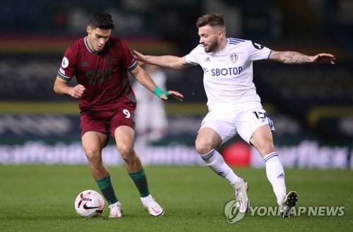 epa08758097 Stuart Dallas of Leeds (R) in action against Raul Jimenez of Wolverhampton (L), during the English Premier League match between Leeds United and Wolverhampton Wanderers in Leeds, Britain, 19 October 2020. EPA/ALEX PANTLING / POOL EDITORIAL USE ONLY. No use with unauthorized audio, video, data, fixture lists, club/league logos or 'live' services. Online in-match use limited to 120 images, no video emulation. No use in betting, games or single club/league/player publications.