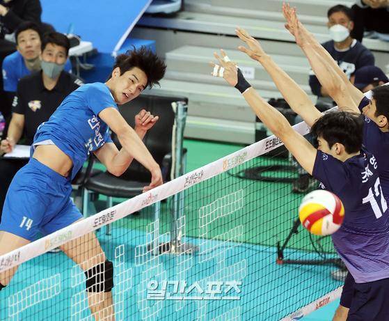 2020~2021 프로배구 V리그 남자부 대한항공과 한국전력의 경기가 6일 오후 인천 계양체육관에서 열렸다. 임성진이 스파이크공격을 하고 있다.