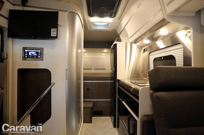 포레스트의 실내로 고개를 돌려보면 출입구 옆으로 부드럽게 열리는 화장실겸 샤워실이 반대편에는 주방과 150리터 냉장고 등의 시설이 자리하고 있다. 전체적인 옵션들이 깔끔하게 자리하고 있고 편리하게 활용할 수 있는 구조이다. 넉넉한 수납공간과 싱크대 구성이 돋보인다.