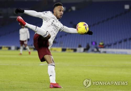 epa08910090 Pierre-Emerick Aubameyang of Arsenal in action during the English Premier League soccer match between Brighton & Hove Albion FC and Arsenal London in Brighton, Britain, 29 December 2020. EPA/Frank Augstein / POOL EDITORIAL USE ONLY. No use with unauthorized audio, video, data, fixture lists, club/league logos or 'live' services. Online in-match use limited to 120 images, no video emulation. No use in betting, games or single club/league/player publications.