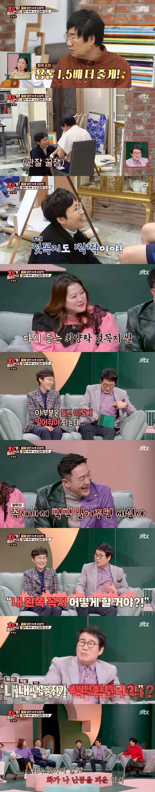 팽현숙은 최양락에 구박에도 꿋꿋하게 정물화를 완성했다. 하지만 팽현숙은 마음에 들어하지 않았고 이내 최양락에 노출을 부탁, 누드화를 그리겠다고 선언했다.