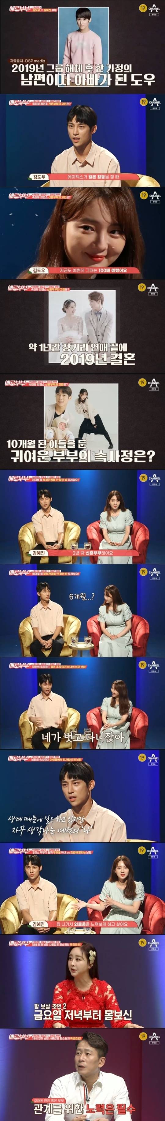 9월 28일 방송된 채널A 예능 프로그램 '다시 뜨거워지고 싶은 애로 부부'(이하 '애로부부')에서는 아이돌 출신 김도우와 김혜진 부부가 ‘속터뷰’ 코너에 출연했다.