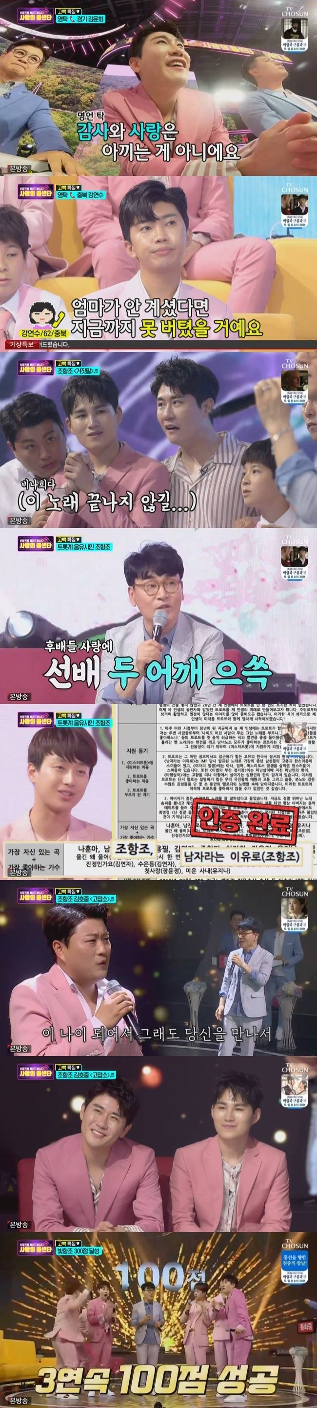 100점 도전에 이미 성공한 조항조는 남은 무대는 TOP 7과 축제처럼 즐기기로 했다. 조항조는 “나름대로 아끼는 곡으로 콘서트에서 불렀는데 그 곡을 김호중 씨가 불러서 재조명 시켜주니까 너무 고맙더라”며 ‘미스터트롯’ 경연에서 김호중이 불러 큰 화제가 됐던 ‘고맙소’로 듀엣 무대를 가졌다.