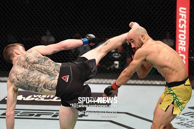모라에스는 카운터 펀치로 맞섰다. 하지만 레그킥을 계속 허용하며 신경이 아래 쪽으로 쏠렸다.