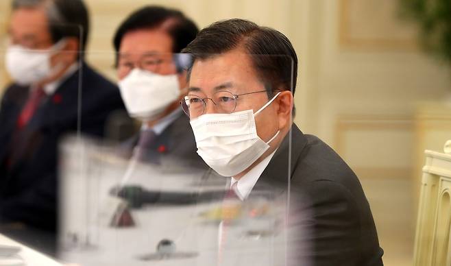 | ▲ 문재인 대통령이 22일 오전 청와대에서 열린 '5부요인 초청 간담회'에서 노정희 중앙선거관리위원장 발언을 듣고 있다. |