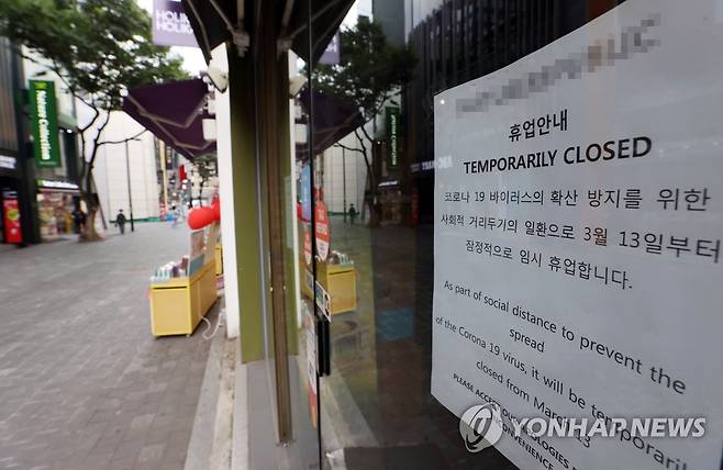 (서울=연합뉴스) 김인철 기자 = 신종 코로나바이러스 감염증(코로나19) 확산으로 인한 '사회적 거리두기 2단계' 조치가 시행 중인 24일 오후 서울 중구 명동의 한 매장에 코로나19로 인한 임시휴업 안내문이 붙어있다. 2020.8.24