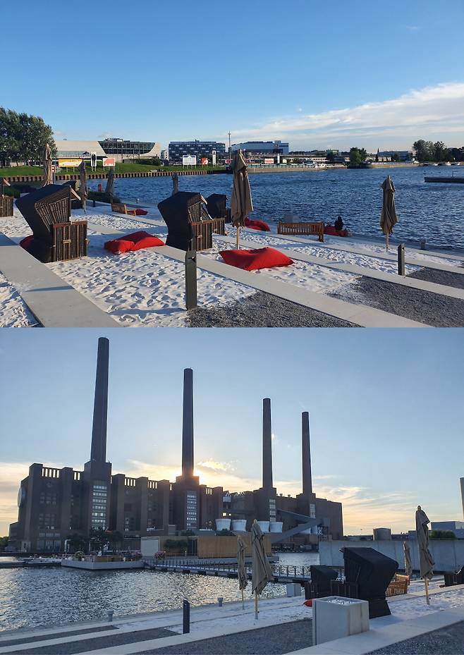 구경거리 많은 이 테마파크에서 개인적으로 특히 마음에 들었던 곳이 있습니다. 입장해서 바로 좌측, 그러니까 공장 굴뚝이 보이는 쪽으로 조금 걸어가면 이곳이 내륙인지 북부 바닷가인지 착각하게 만드는 곳이 나오는데요. 독일 바닷가에서 흔히 볼 수 있는 슈트란트코르브(Strandkorb)에 앉아 모래에 발을 파묻으면 절로 힐링이 될 듯합니다. 오래 앉아 있다고 뭐라 할 사람 없으니 아우토슈타트를 방문하셨을 때 놓치지 말고 마음껏 즐겨보시기 바랍니다.