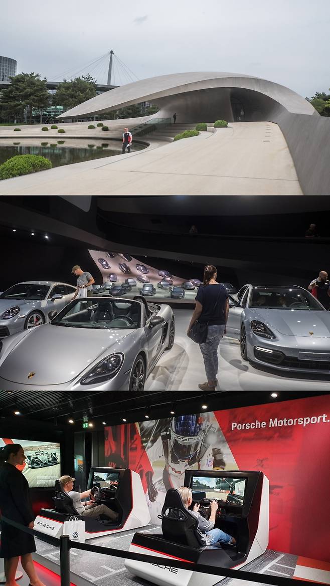 아우토슈타트에 있는 파빌리온들 중 가장 최근에 지어진 포르쉐 전시관은 주변 풍경과 어울리는 멋진 디자인으로 많은 플래시 세례를 받습니다. 미니멀니즘이 반영된 건축 양식은 그 자체로 충분히 즐길 거리가 되죠. 과거부터 현재까지 이어지는 자신들의 모델 역사를 모형으로 쭉 이어 놓은 것은 하나의 설치 작품이라 해도 과언은 아닙니다. 이 파빌리온 입구엔 911을 만든 페리 포르쉐(포르쉐 박사의 아들)가 한 말이 이렇게 적혀 있습니다. "처음엔 둘러보았다. 하지만 내가 꿈에 그리던 차를 찾을 수 없었다. 그래서 난 직접 차를 만들기로 했다."
