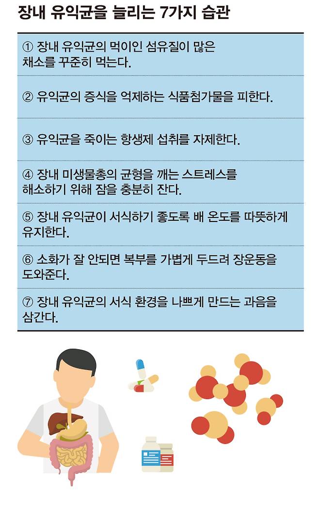 이들 미생물은 나름대로 균형을 이뤄 존재하는데 사람이 가장 건강한 상태는 유익균 25%, 유해균 15%, 중간균 60%일 때다. 이렇게 균형을 이루면서 사는 장내 미생물 집단을 '장내 미생물총'(마이크로바이옴)이라고 한다.