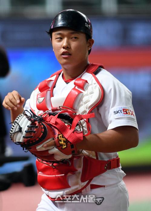 SK 포수 현원회가 9일 인천 SK행복드림구장에서 열린 2020 KBO리그 SK와 NC의 경기 9회초 수비를 마친 뒤 덕아웃으로 들어가고 있다. 현원회는 8회초 이현석을 대신해 포스 마스크를 쓰면서 데뷔 첫 출전을 기록했다. 2020. 7. 9.