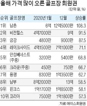 경기 안성베네스트CC의 주중 회원권 가격은 연초 3200만원에서 이날 5400만원을 기록하며 68.8% 올랐고, 같은 기간 제주 크라운CC 주중 회원권 가격도 450만원에서 750만원으로 66.7% 뛰었다. 경기 여주 금강CC 회원권 가격은 4800만원에서 9000만원으로 87.5% 상승했다.