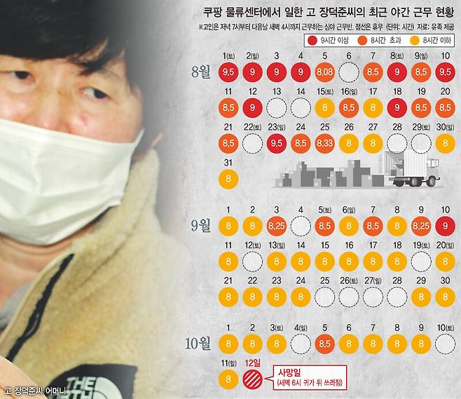 그런 아들을 보며, 부부는 물류센터를 관두고 다른 일자리를 알아볼 것을 여러차례 권유했다. 하지만 아들은 “조금만 더 기다려달라” “이거 일단 해보고 (생각해보겠다)”라며 학교 교수 등이 소개한 면접 기회를 마다했다. 엄마는 ‘심야노동 지옥’을 말하면서도, 아들이 물류센터 근무일수에 목을 매는 이유를 이해할 수 없었다. 아들은 지난 8월에는 25일, 9월은 23일, 이달 들어선 12일 사망 직전까지 9일을 일했다. 지난 8월15~21일, 9월5~11일에는 주 7일씩 연속 근무를 한 적도 있다.