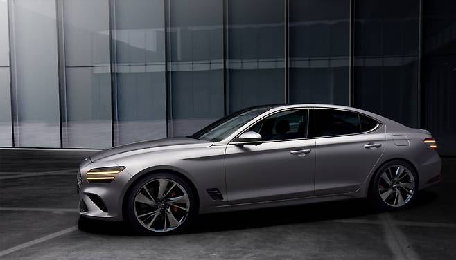 앞모습은 역동적이다. 제네시스 로고의 방패에서 영감을 받은 ‘크레스트 그릴’은 헤드램프보다 낮게 자리했다. 두 줄로 나눈 ‘쿼드램프’는 대각선으로 빚어 G80 등 상위 모델보다 역동적이다. 또한, 옆모습은 바퀴 주변부에 입체감을 줘 육상 선수와 같은 근육질의 느낌을 준다.