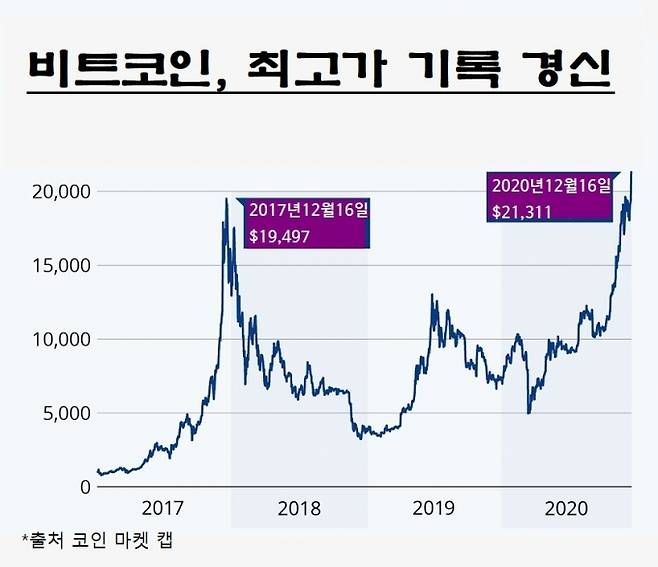 [아이뉴스24 김상도 기자]비트코인 가격이 지난 16일 21,311달러를 기록하면서 지난 2017년의 최고가 19,497달러를 경신했다.