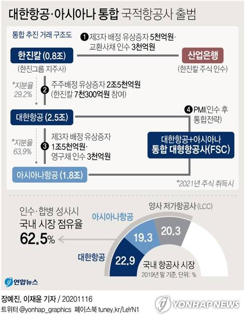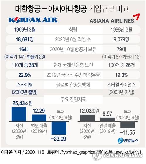 (서울=연합뉴스) 최평천 기자 = 대한항공이 아시아나항공을 인수하면 우리나라 대형항공사는 1개로 통합된다.