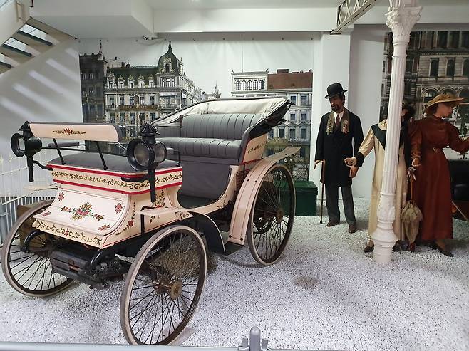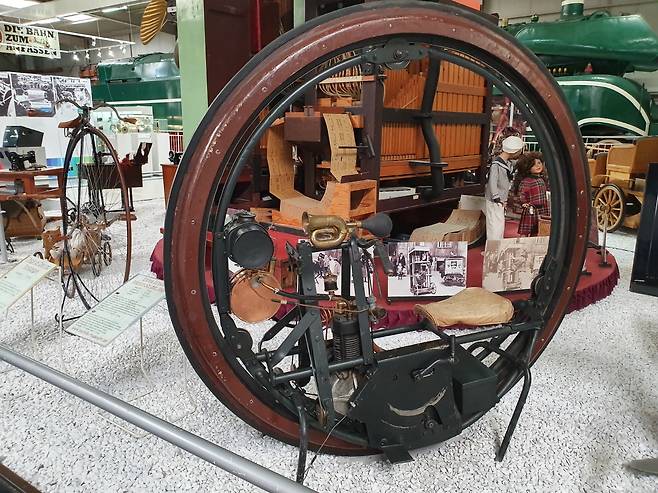 또 1894년 만들어진 세계 최초의 외발 오토바이 역시 진스하임 자동차 박물관에서 볼 수 있는 독특한 전시물입니다. 프랑스 파리에서 만들어진 이 외발 오토바이는 지름이 1.7m에 무게는 150kg에, 엔진은 1실린더 3.5PS짜리가 들어가 있습니다. 오토바이 옆에 있던 자료 영상을 보니 운전하기가 절대 만만치 않았습니다.