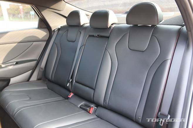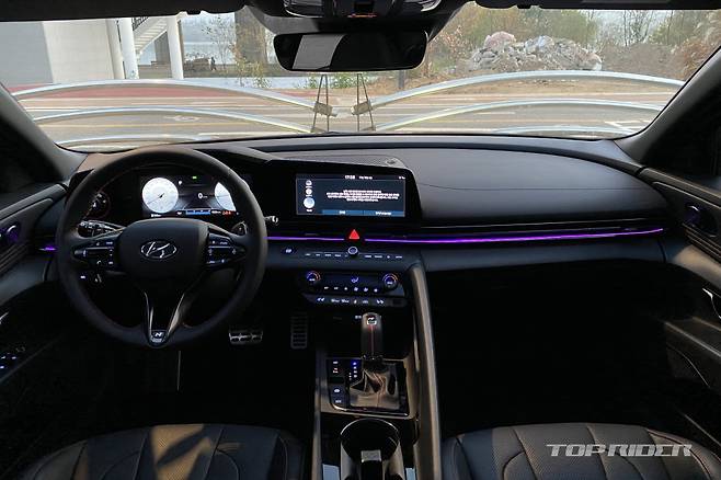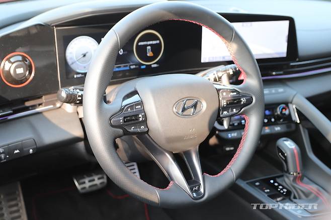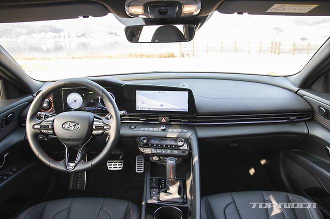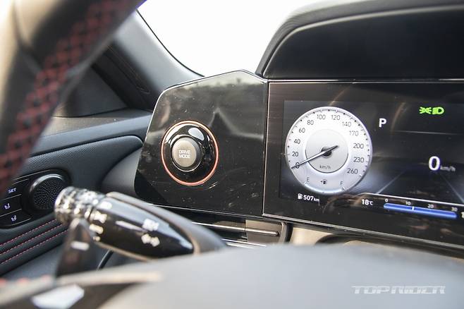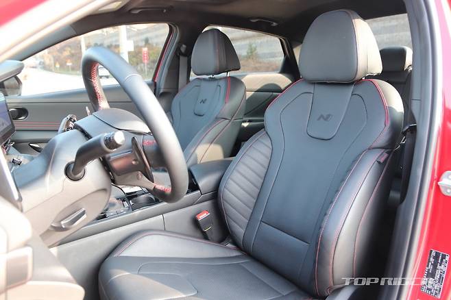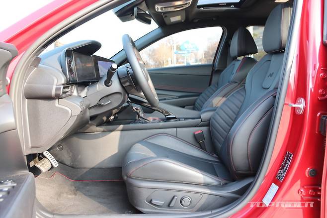 아반떼 N라인의 시트 포지션은 일반 아반떼와 같다. N라인인 만큼 시트 포지션을 더 낮춰도 좋을 것 같다. 또한 계기판 좌측으로 옮겨진 드라이브 모드 버튼의 위치도 의아하다. 180cm 성인 기준 시트 포지션에서 등받이에서 등을 떼지 않으면 버튼이 닿지 않는다.