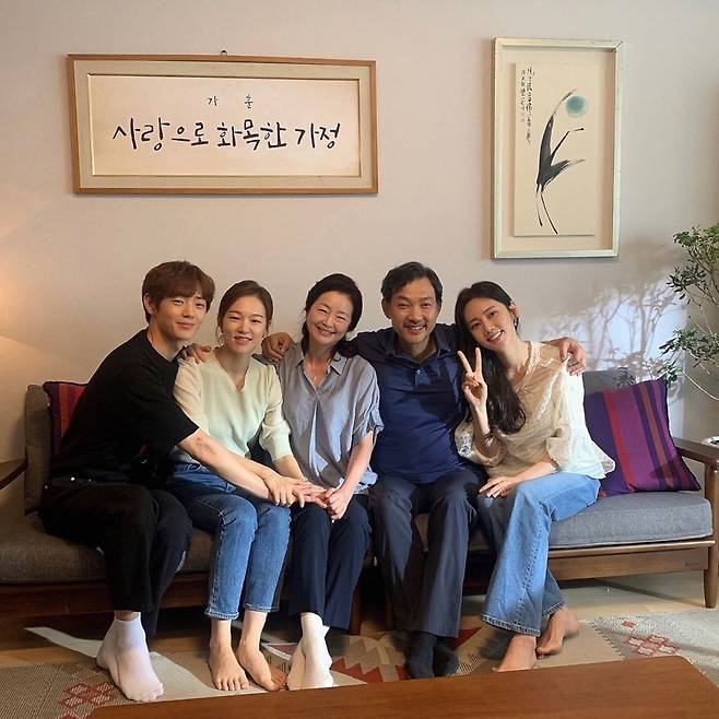 오순도순 모여있는 다섯 사람의 위로 가훈 '사랑으로 화목한 가정'이라고 적혀있어 눈길을 끈다.