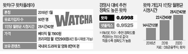 왓챠는 2011년 설립 이후 작년까지 연평균 191%의 매출 증가율을 기록 중이다. 가입자 1인당 월평균 시청시간도 빠르게 늘고 있다. 2016년 14시간12분이었던 시청시간은 올해 1분기 말 기준 28시간42분으로 두 배 이상 늘었다.