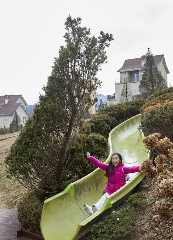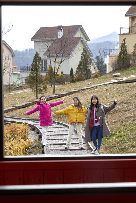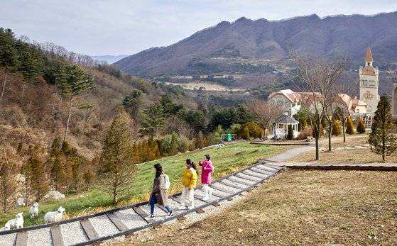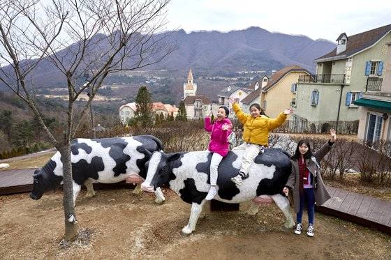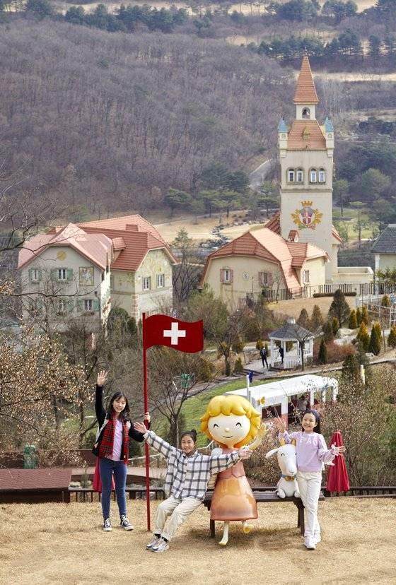 마을 끝자락에 있는 에델바이스 광장에는 전경을 감상할 수 있는 전망대가 있었습니다. 스위스 국기와 하이디, 젖소 등 다양한 조형물이 있는 모습이 스위스 리기산 정상에 있는 것과 흡사했죠. 에델바이스 광장에서 계단을 통해 내려오면 철도 레일같이 만들어진 길이 이어져 있고 왼쪽으로는 인터라켄에서 융프라우로 가는 산악열차 모형을 만들어 놓았어요. 언젠가 직접 산악열차를 타고 융프라우를 올라갈 날을 잠시 꿈꿔봤습니다. 곡달산을 배경으로 유럽식 건물 사이 쭉 뻗은 산책로에선 지금 당장 하이디가 달려 나올 것만 같았죠. 절묘한 각도로 사진을 찍으면 스위스에서 직접 찍었다고 해도 속을 만한 전경이 계속 펼쳐집니다. 닭과 토끼 등이 뛰어노는 동물농장, 양떼목장, 사랑의 연못 등 다양한 볼거리로 시간 가는 줄 몰랐어요.