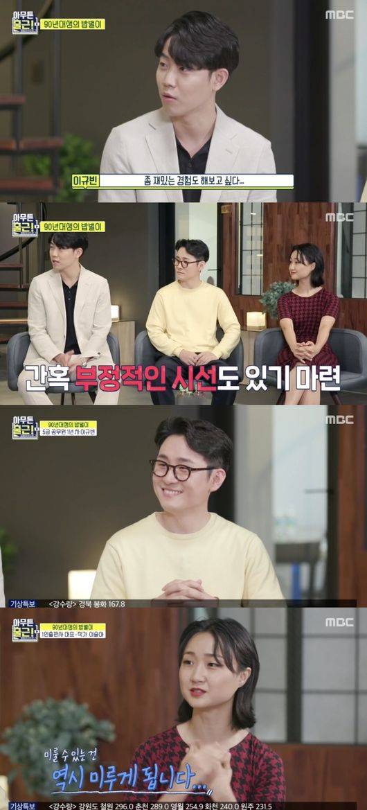 3일 밤 첫 방송된 MBC 새 파일럿 예능 프로그램 '아무튼 출근'에서는 이규빈, 이민수, 이슬아 90년대생 3인방의 직장 생활이 공개됐다.
