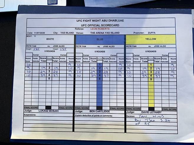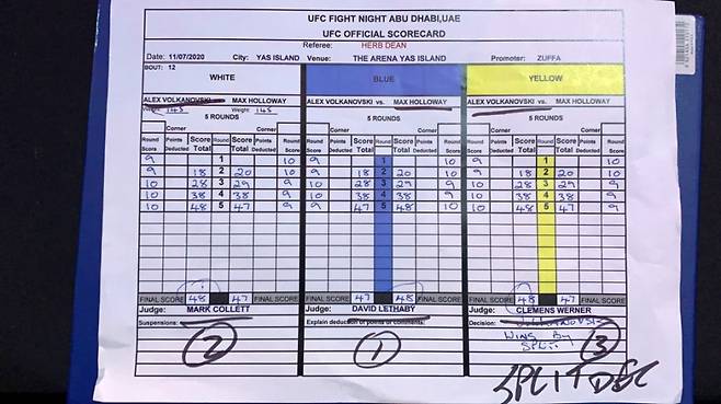 데이나 화이트 대표는 알렉산더 볼카노프스키와 맥스 할로웨이의 채점 결과에 동의하지 않았다. "경기 결과를 심판들에게 넘겨선 안 된다. 옳지 않은 채점(bad judging)이 나온다. 할로웨이가 아직 여기 왔는지 모르겠다. 크게 실망했을 것"이라고 말했다. 기자들의 채점을 정리하는 MMA디시전스닷컴에 따르면, 볼카노프스키의 판정승이라고 본 기자는 9명뿐이고 할로웨이의 판정승이라고 본 기자는 18명이나 됐다. (기자회견)